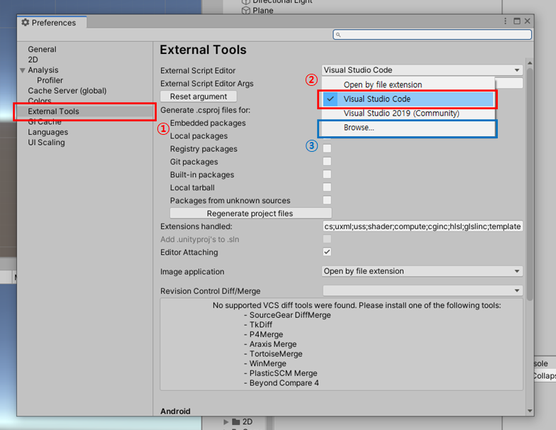 ③ External Tools를 선택한 후 External Script Editor에서 Visual Studio Code를 선택합니다. 기본적으로 Visual Studio Code가 보이지 않는 분들은 [Browse...] 버튼을 선택하여 [실습 2]에서 우리가 선택한 경로를 따라가 Visual Studio Code를 선택하면 됩니다.