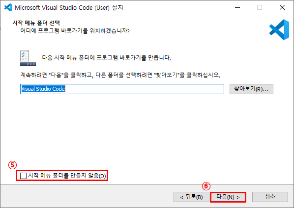 ④ 시작 메뉴에 폴더를 만들 것인지를 설정하고, [다음(N) >] 버튼을 누릅니다.