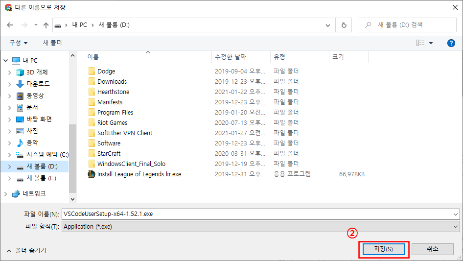 ③ 자신이 설치하려는 경로에 VSCodeUserSetup을 설치합니다.① 자신의 OS에 해당하는 버전을 다운로드합니다. ② 알맞은 경로를 설정하고, 저장버튼을 누릅니다. Setup 파일 다운로드가 모두 끝났다면, 파일 실행을 통해 Visual Studio Code를 본격적으로 컴퓨터에 다운로드할 수 있습니다.